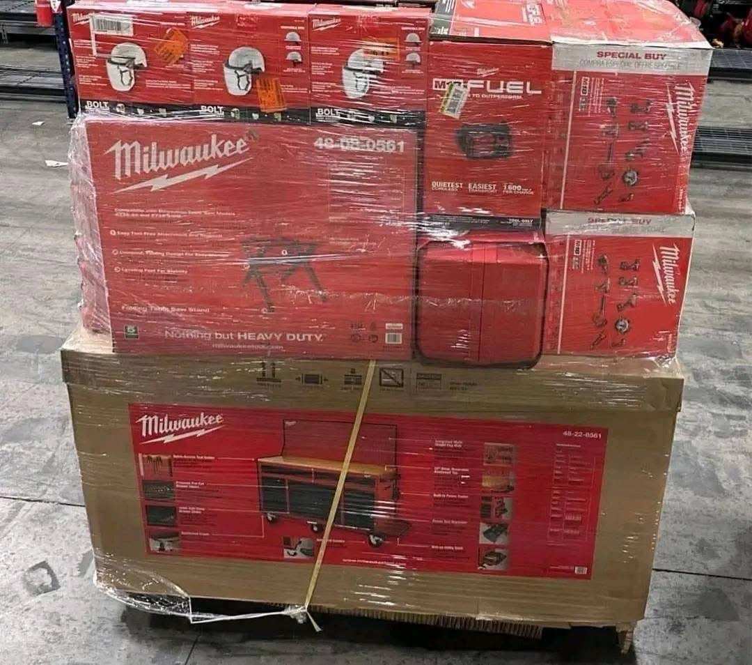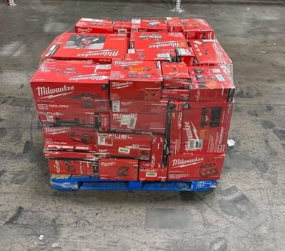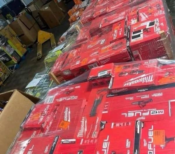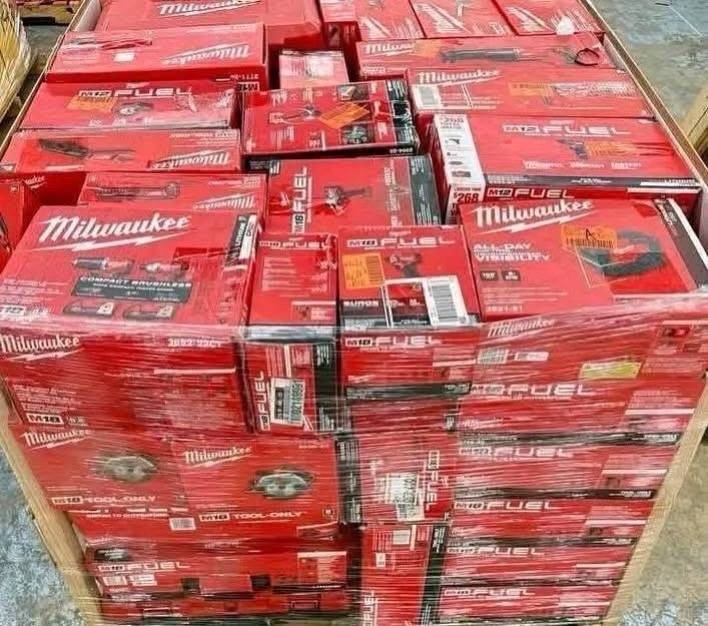 Milwaukee tools pallets available in warehouse house sold completely with all accessories etc. 150 pieces in each pallets, sold with warranty.